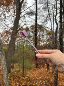 I have curly hair. No matter what I do, after a day of hiking and a night of sleeping, I’ve got a rat’s nest. A hairbrush is definitely a luxury item, but this little brush is small and lightweight. The strap allows my hand to become the handle. It only weighs an ounce, and brushing out my hair feels so good, totally worth it.